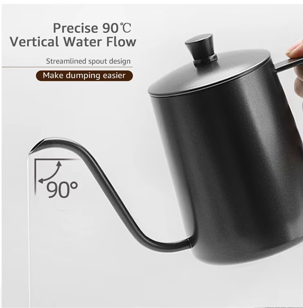 غلاية قهوة مقطرة يدوية من الفولاذ المقاوم للصدأ، بتصميم فوهة انسيابي يضمن تدفق ماء عمودي دقيق بزاوية 90 درجة مع إمكانية التحكم السهل في تدفق الماء لتسهيل عملية التقطير وتحضير القهوة بأعلى جودة.